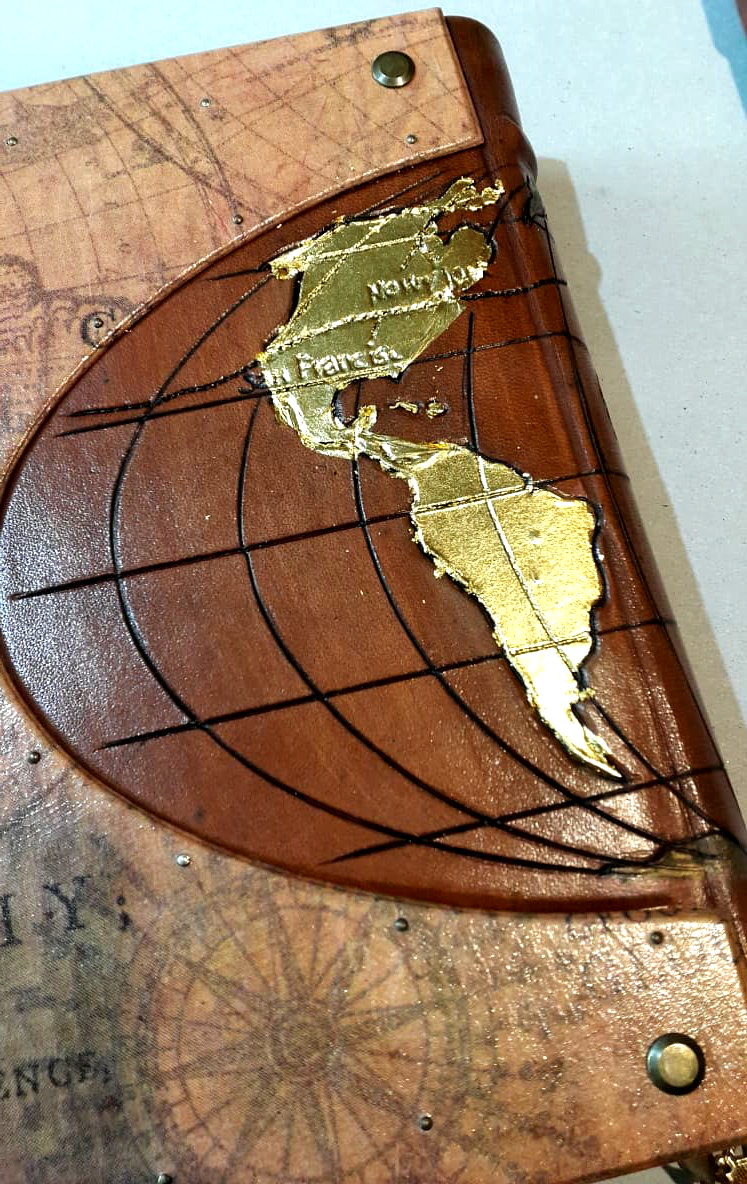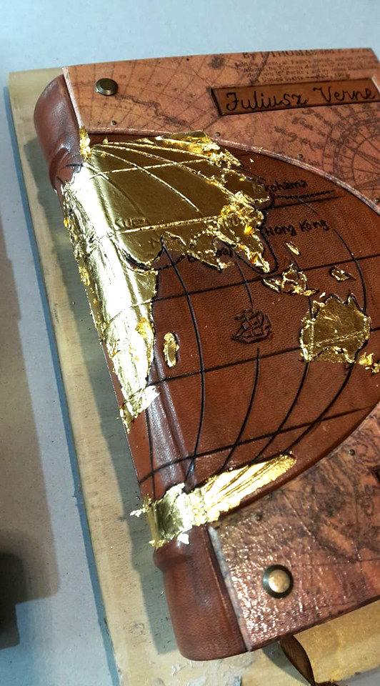 Czasem gdy książka zbyt długo leży i czeka na nowego właściciela zaczyna wywoływać chęć pewnych zmian. Tak się stało w przypadku dwóch książek: W 80 dni dookoła świata oraz Baśnie tysiąca i jednej nocy. Elementy które wcześniej były pomalowane złotą farby zostały oczyszczone i pokryte 23 3/4 karatowym złotem płatkowym. Doda to na pewno elegancji i polotu.